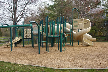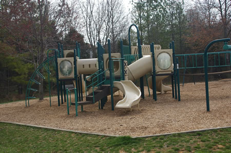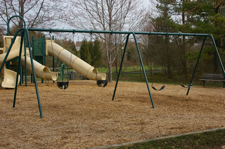 This area features swings, a Jungle Gym, and 2 basketball courts. There are benches but no picnic table. The area is not shaded. This play site is for Reston Association members only.