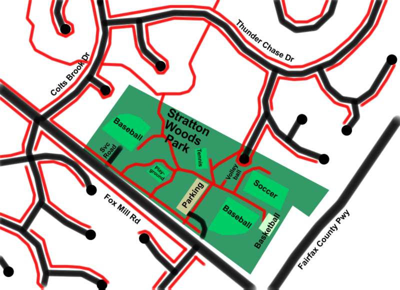 Stratton Woods Park is a Fairfax County Park adjacent to Reston with a primary emphasis on sports. It does have a small play area and picnic table in a shady portion of the park. Reservations are accepted for the play area. Click here for information on reservations. Click here to view the entrance to the park in Google Maps. The park was built after the aerial photo used by Google was taken. The following are photos of some of the areas of the park:
